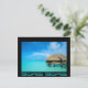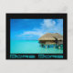 Postal con bungalow en luna de miel en un complejo de lujo en la laguna azul clara de la isla pacífica de Bora Bora, cerca de Tahití en el archipiélago de la Polinesia Francesa. com com. com