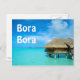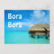 Postal de un bungalow sobre el agua en luna de miel con techo de paja en la laguna azul turquesa de la isla tropical de Bora Bora, cerca de Tahití en la Polinesia Francesa, con el texto "Bora Bora".