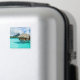 Imán fotográfico de recuerdo de un bungalow sobre el agua con techo de paja en luna de miel en un complejo turístico en la clara laguna turquesa de la isla tropical Bora con vistas al monte Otemanu cerca de Tahití en la Polinesia Francesa.