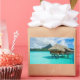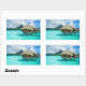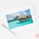 Pegatina fotográfico rectangular de un bungalow sobre el agua con techo de paja en luna de miel en un complejo turístico en la clara laguna turquesa de la isla tropical Bora con vistas al monte Otemanu cerca de Tahití en la Polinesia Francesa.