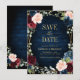 Elegante y moderno color de agua geométrica de estilo romántico floral, salvo la tarjeta de invitación a la fecha, cuenta con hermosos rosas burdeos / marsala, rosa rubí, melocotón, acuarela azul marino, follaje a juego sobre fondo rústico de madera azul marino y marco dorado. Perfecto para un boda de otoño/verano medio. Encontrará más diseños y variaciones de mi tienda "blissweddingpaperie". Y no dudes en ponerte en contacto conmigo para seguir personalizando o coincidiendo con elementos