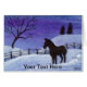Un pequeño paisaje acuático de un burro en un campo de nieve en silueta y un cielo estrellado y nocturno.