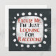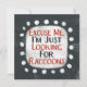 Un diseño tipográfico de animales irreverente que dice "Disculpe, sólo estoy buscando mapaches". Presenta texto en negro y rojo sobre un rectángulo blanco con puntos blancos divertidos y juguetones rodeándolo, todo sobre un fondo gris.