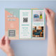 Plantilla de folleto comercial en tonos azul y melocotón con fotos de productos, plantilla de logotipo y lugar para su código QR. La plantilla de pliegue tiene título comercial, texto más pequeño y una plantilla de logotipo en el frente. Añada una gran foto de su tienda, o ubicación para cubrir la parte posterior del periódico, donde se coloca una sección "about" y una foto. Este ejemplo de volante está destinado a plegarse - último panel hacia dentro y luego hacia el tercero y hacia atrás, detrás de la portada. El volante plegado en z es alto y delgado y se abre hacia fuera para mostrarlo todo en esta primera parte del papel. Cuando miren en la parte de atrás verán su foto y la sección sobre.