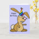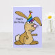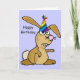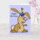 Diseño hilarante del conejo de conejito del dibujo animado. Él es lleno de personalidad con un oído ascendente y un oído tirado y tiene un gorra del cumpleaños.