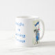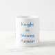 Una taza blanca, adornada con un caballero en armadura en un caballo.