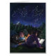 El arte nocturno estrellado de Traci Van Wagoner print, posters, accesorios y regalos presenta nuestra pintura original de dos niños y su perro negro grande acampando bajo las estrellas leyendo un fantástico libro alrededor de un incendio en un campamento sobre caballeros y dragones. La magia de la historia se desliza hacia el cielo estrellado para mostrar un caballero y un dragón en un eterno baile nocturno de estrellas. Disfrute de un campamento nocturno de verano en las montañas.