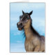 Representación digital 3D de un lindo y sonriente caballo grulla con ojos azules sobre fondo azul del cielo. Un regalo perfecto para todos los que aman la diversión y se ríen