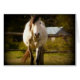 Una fotografía a todo color hermosa del retrato de un caballo blanco. El foco de lujo da la ilusión añadida del movimiento mientras que sale con tolerancia y poder a través de un campo rural, con el cercado y una estructura del granero en el fondo levemente desenfocado. La cola y la melena aparecen sacudirse en una brisa tranquila de la tarde. Mágico y elevando, esta imagen se adapta a muchas ocasiones. Personalice cualquier artículo con su propio texto para crear un regalo único del caballo para el jinete ecuestre del amante o de lomo de caballo.