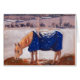 Tarde en una tarde nevosa de Vermont, un caballo blanco se coloca de consumición del heno, cómodo en su manta azul. Una pintura del aguazo del sketchbook de Ashley.