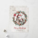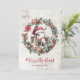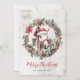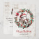Diseño de Navidad con un hermoso caballo gris y blanco con sombrero de Santa en corona de acebo y bayas de Navidad con fondo de madera desgastada de granero blanco.