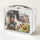 Almuerzo personalizado de bonito para niños con un caballo Pinto pardo, blanco y negro parado frente a un antiguo granero rústico rodeado de girasoles.