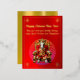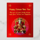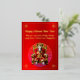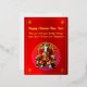 Nuestra carta de Relieve metalizado de Año Nuevo Trono con caballo tiene la imagen de un majestuoso caballo con una corona y sentado en un trono impreso en un lujoso fondo rojo.