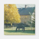 Un caballo de pastoreo suave frente a una casa de piedra y un árbol amarillo.