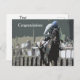 Caballo Con Jockey En Azul, Postales. Arte Digital. Caballo de carreras con jockey en capucha azul, galopantes hacia la línea de meta en Shawan Downs, Maryland. Personalizable completo. Edite la redacción a su gusto.
