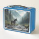 Impresionante foto de un caballo en un arroyo, aparece a ambos lados de esta metalizado lonchera. La lonchera es azul claro con imágenes del caballo delante y atrás. ¡Una buena manera de llevar el almuerzo a la escuela, sobre todo para los amantes del caballo!
