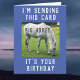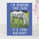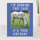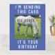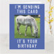 Tarjeta de cumpleaños con un divertido mensaje de caballo! Enviaré esta tarjeta a caballo grande (porque) es tu cumpleaños. La imagen es una fotografía de un caballo blanco pastoreando en un campo.