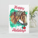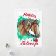 Un caballo dibujado a mano con una brida y un adorno rojo - bola. Alrededor de la cabeza del caballo, salpicaduras de turquesa aportan un contraste vibrante.