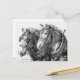 Este dibujo rinde homenaje a esos íconos históricos conocidos como "caballos pesados". Una vez parte integral de casi todos los aspectos de nuestro pasado agrícola, los caballos de tiro (o de 'trabajo') ahora se crían y disfrutan por su increíble tamaño, fuerza, gracia y dulzura de temperamento. El dibujo está realizado con pluma y tinta para capturar con precisión la belleza de los animales, su firmeza paciente y la complejidad del arnés que permite controlar a estos 'gigantes gentiles'. Esta tarjeta postal sería perfecta para el entusiasta de los caballos de tiro en su lista de regalos.