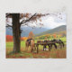 Caballos enganchados en una montaña con montañas y follaje de fondo.