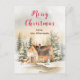 Esta hermosa y festiva tarjeta postal de Navidad de acuarela se puede personalizar con el nombre de su familia. Cuenta con una rústica cabaña de invierno rodeada de nieve y árboles. Hay adorables animales, como un alce y un perro husky, y también follaje. El texto combina fuentes manuscritas y sans serif para un look elegante y moderno.