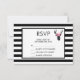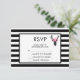 Tarjeta de respuesta de boda o evento con una cabeza de ciervo negra hecha con líneas geométricas y que lleva una corona floral rosa. Diseño rústico y moderno. El fondo es un patrón de rayas negras y blancas con un marco blanco con borde negro superpuesto.