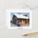 Postal de una tradicional cabaña de madera cubierta de nieve en Laponia. Un lugar ideal para pasar las vacaciones navidades. Tiene un borde blanco y el texto: 'Laponia'.