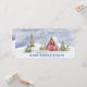 Esta adorable tarjeta de felicitación de invierno incluye una cabina roja con marco A para la nieve de invierno con un texto que dice "cálidos deseos de invierno". La parte trasera tiene una colina nevada con espacio para escribir en tu propio mensaje.