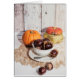 Todavía la vida de otoño de época de castañas en una maravillosa copa histórica con calabazas de colores en un rústico encaje vintage, algunas castañas y una vieja tabla de madera como fondo. Derechos reservados © Uta Naumann 2017.
