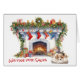La parte delantera de esta tarjeta de Navidad tiene una imagen de un adorable cachorro Beagle acostado en su cama frente a una chimenea decorada, esperando ansiosamente a Santa Claus. El texto rojo en la parte inferior dice "Esperando a Santa". El texto es personalizable, al igual que todo el texto interior, así que puede hacer que diga lo que quiera. ¡Lindo! Vea más imágenes de Beagle, junto con docenas de otros productos de razas de perros, en Dog Village.