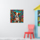 Adorable y caprichoso arte con un perro cachorro marrón y blanco rodeado de flores de arte folclórico rosa, naranja y morado.