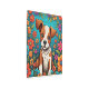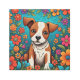 Adorable y caprichoso arte con un perro cachorro marrón y blanco rodeado de flores de arte folclórico rosa, naranja y morado.