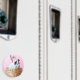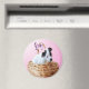 En una cesta se ve un cachorro de estornino de Staffordshire en blanco y negro