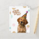 Celebra el día especial de alguien con esta encantadora postal que incluye un adorable cachorro de recuperación dorada que usa un gorra festivo fiesta. El diseño lúdico va acompañado de un audaz mensaje de "¡Feliz cumpleaños a ti!" con una fuente elegante y moderna. Perfecto para mandar cálidos deseos de cumpleaños a los amantes del perro y amigos por igual. ¡Esta postal te hará sonreír y alegrar tu cumpleaños! Ideal para uso personal o como regalo único.