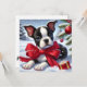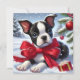 Un adorable cachorro del Boston Terrier con un arco rojo bajo una nevada junto a decoraciones navideñas evoca la alegría festiva.