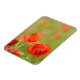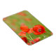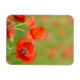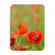 Imán fotográfico vertical con flores rojas vibrantes de amapola en un campo verde lleno de amapolas. Tiene una fuerte emoción de felicidad, primavera y verano.