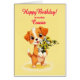 Una linda tarjeta de cumpleaños para un primo. Un cachorro adorable sosteniendo un ramo de flores y diciendo 'Feliz cumpleaños'. Celebra un cumpleaños con esta irresistible carta mostrando a un dulce cachorro sosteniendo un ramo de flores de margarita, perfecto para derretir corazones.