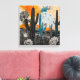 Esta obra de arte representa un paisaje desértico con altos cactus negros frente a un vibrante y abstracto fondo de cálidos naranjas y frescos lavados de color azul. Los cactus se ilustran en un estilo de linocut, con líneas osadas, oscuras y textura detallada, contrastando con los colores más suaves y fluidos del cielo. Los patrones circulares y ondulados en el fondo sugieren un efecto de sol o de ola de calor, añadiendo un intenso sentido de calor y sequedad a la escena. Delicados árboles sin hojas y detalles de tierra desértica rota completan el árido y escaso paisaje.