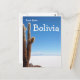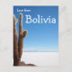 Postal de un cactus gigante sobre las salinas blancas del Salar de Uyuni en Bolivia con el texto: 'Amor de Bolivia'.