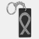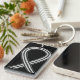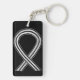 La cadena de claves muestra el arte de una cinta de pintura de conciencia en blanco y negro que representa la conciencia para acabar con el racismo. La cadena de teclas de la cinta de concientización en blanco y negro se puede personalizar con mensajes personalizados para hacer grandes cadenas de claves para recaudar fondos, regalos de concientización u otros eventos o ocasiones especiales.