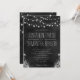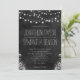 String de Lights Chalkboard © Sunny Mars Designs. Elegante, moderno, elegante, elegante, de moda, personalizable de moda formal o lindo e informal invitaciones de boda de 5" x 7" con un hermoso diseño de pizarra negra con bombillas de cuerda o de cuerda colgando encima con un diseño tropical floral debajo.