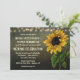 Rustic String Lights Sunflower Wedding Invitation - presenta un fondo rústico con luces de cuerda y un girasol. El texto muestra un estilo rústico tallado como fuente para nombres y celebración boda.