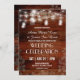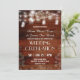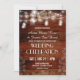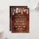 La elegante y moderna invitación incluye jarras de albañil, luces de cuerda, eucalipto sobre un fondo rústico de grano de madera. Haga clic en el personalizar para cambiar el estilo de fuente o agregar más texto para adaptarlo a sus necesidades.