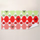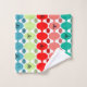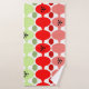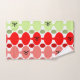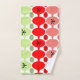 Este conjunto de toallas tiene un diseño moderno de mediados de siglo de ovales rojos, rosas, verdes y azules unidos en líneas verticales con starbursts dispersos entre ellos.