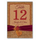 Lleva tu rústica hoja de otoño, la temática boda "Caer en amor" a tu recepción con esta pequeña tarjeta de número de mesa boda de 3.5"x5" con fondo de textura burlap simulada, el papel Kraft parece un área de texto recortada en vino y naranja con una imagen de cinta borgoñona que recorre el fondo de la tarjeta con un cúmulo de hojas de otoño y un pequeño corazón de madera simulado de oro en burdeos letras de tono que dicen "Caer en amor". El texto es una mezcla de vino y naranja y tiene un número de personalizable que USTED debe CAMBIAR por cada número de tabla que necesite. Agregue cada número de tabla a su carrito y repita el proceso hasta que tenga todas las tarjetas separadas que necesite en su carrito. Zazzle NO imprime secuencialmente los números. Si necesita elementos adicionales coincidentes, envíe su solicitud a niteowlstudio@gmail.com o utilice la función de chat Zazzle para ponerse en contacto.