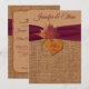 Envíe una atractiva invitación a bodas a toda su familia y amigos con esta rústica invitación de bodas de otoño con un fondo de textura burlap simulada, el papel Kraft parece un área de texto recortada en vino y naranja con una imagen de cinta borgoñona de vino que cruza la parte superior de la invitación con un racimo de hojas de otoño y un pequeño corazón de madera simulado en oro con letras de color burdeos que dice, "Caída en Amor". Sus nombres están impresos en vino de borgoña encima de la cinta. En la parte trasera hay un separador de flecha extraíble en un naranja quemado y un pequeño corazón borgoña en la parte inferior de la tarjeta. El texto boda es una mezcla de vino y naranja. Si necesita elementos adicionales coincidentes, envíe su solicitud a niteowlstudio@gmail.com o utilice la función de chat Zazzle para ponerse en contacto.