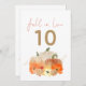 Caer en el amor Sparkly Calabazas número de mesa Boda. Naranja otoñal y crema calabazas y flores con un toque de purpurina falso. El número de la tabla está en oro. La caída en el amor está en la cima de un elegante guión. El mismo diseño está del otro lado.