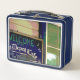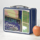La obra de arte en esta caja de almuerzo es una fotografía original de ZoeSPEAK de un letrero y una ventana de un café rústico fuera del café rural. Es un letrero colorido pintado a mano con letras verdes, blancas y azules y notas musicales sobre un fondo oscuro, en un marco de madera. El letrero cuelga de una pared de tablillas de color amarillo pálido con tonos rosados en las sombras, junto a una ventana con persianas de color verde claro colgadas en el interior, y un área de resplandor blanco que refleja ramas de árboles.