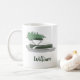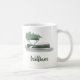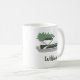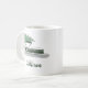Crear un regalo personalizado para Navidades para propietarios de botes pontones. Esta taza de café muestra un ilustracion de un pontón en verde y blanco con un árbol de Navidad verde atado a lo alto. Está listo para ser personalizado con el nombre de una persona o el nombre de un barco en letras de escritura verde debajo. El gráfico y el texto aparecen tanto en la parte posterior como en la parte delantera de la taza.