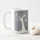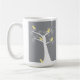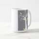 Cinco adorables pájaros amarillos abstractos cuelgan en un árbol blanco sobre un fondo gris en una taza